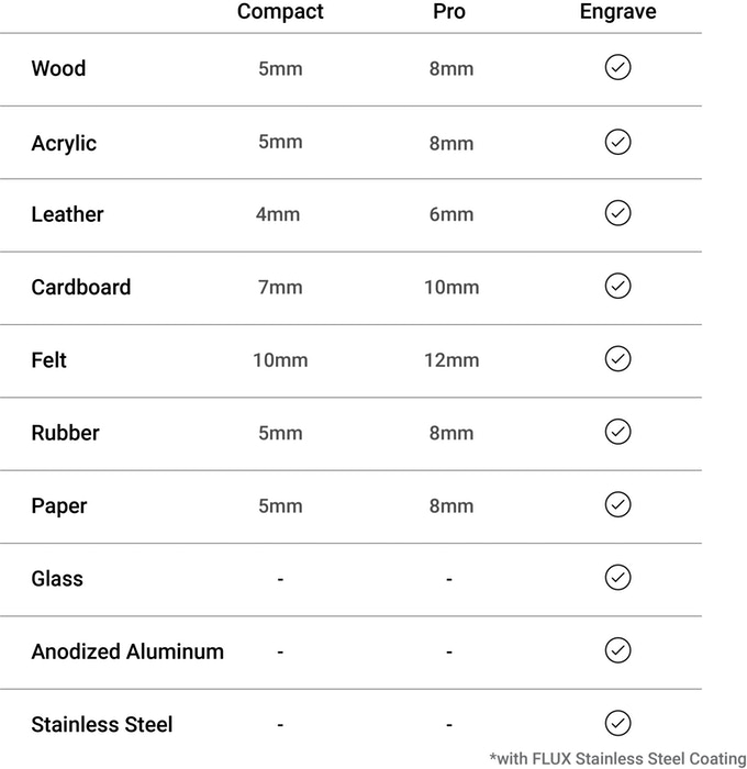 | Laser Cutting Thickness (varies by material) |